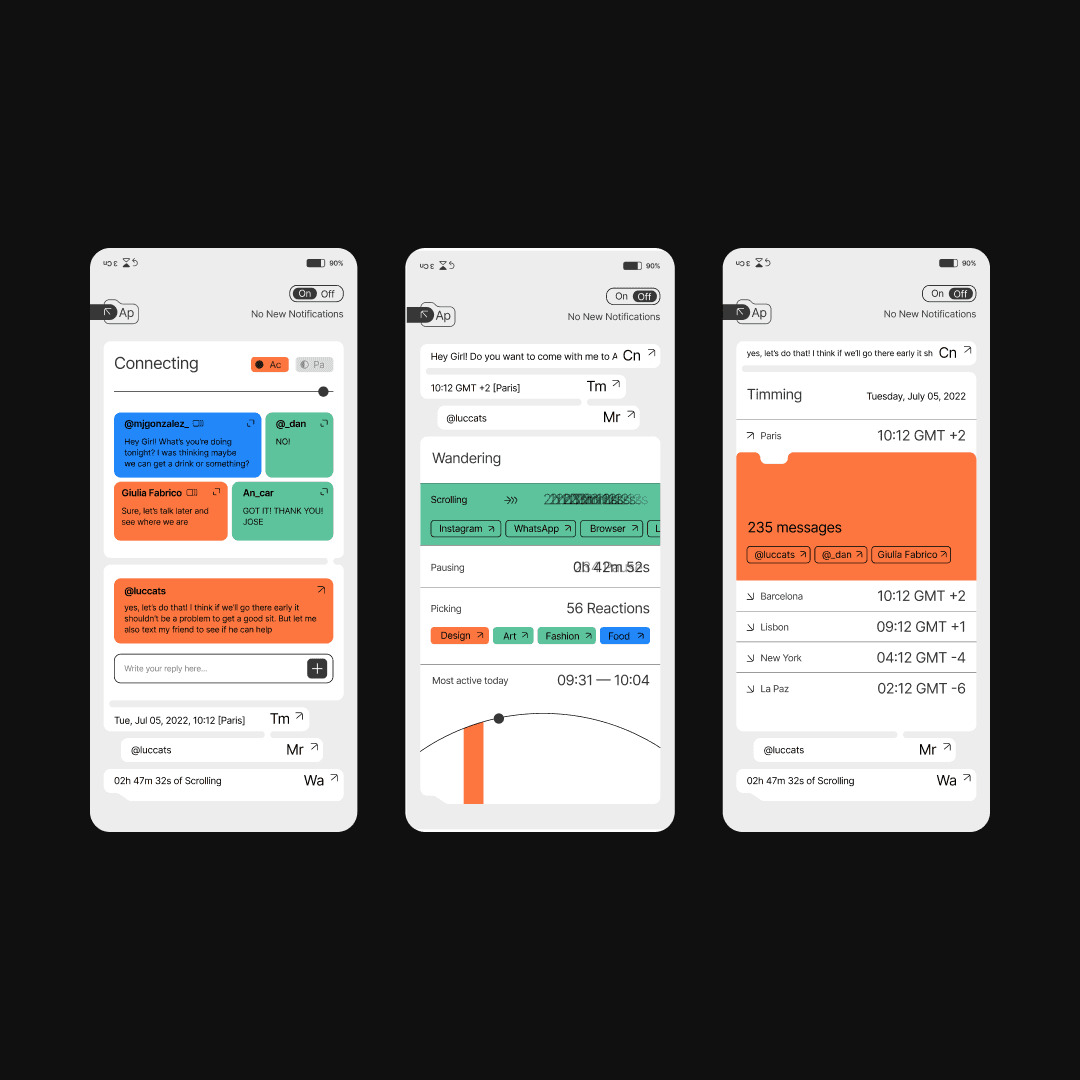 brand identity, UX/UI, art direction, printed materials, and motion design By 2022, 85% of people owned a smartphone — yet the systems we use to navigate them still treat the digital and physical as separate worlds. atOS begins with a different premise: that our phones are already an extension of our minds, and that design should reflect that reality rather than resist it. Developed with Neta Bar-Stav at Elisava School of Design, the project spans a custom operational system designed around attention and presence, a philosophical book exploring the ideas behind the OS, and a jewellery-phone case that physically merges device and body. Every touchpoint — interface, object, image, text — was conceived as a single coherent argument about how we inhabit the world now. Art directed from concept to production, with original photography and handcrafted physical objects. Winner of Laus Plata 2023, Student Category.