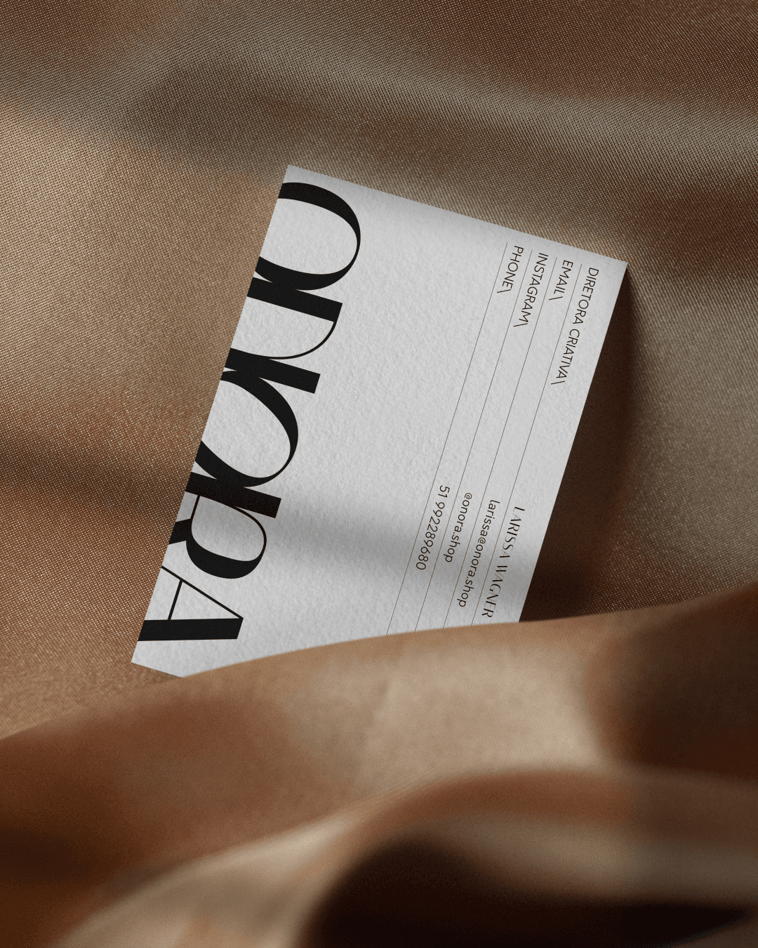 branding, positioning and brand directrices ONORA is a Brazilian slow fashion brand founded by Larissa Wagner, built on a philosophy of intentional design, craftsmanship, and timeless elegance. The identity needed to hold two things at once: architectural strength and feminine softness. The logotype resolves this tension directly — bold vertical forms carry the structural confidence of the brand, while a fluid connection between the N and O introduces grace and continuity. The result is a mark that feels both minimal and expressive, built to last beyond any single season.