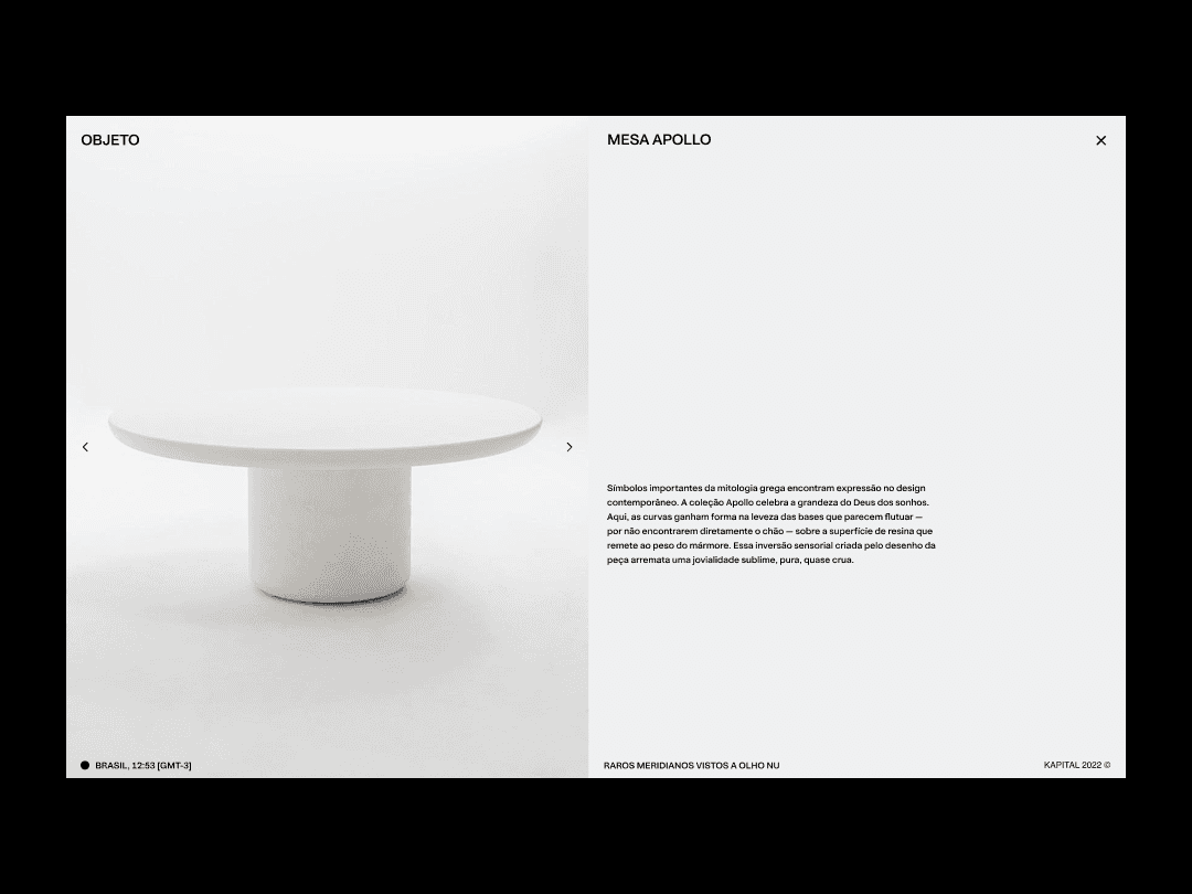 portfolio website and brand materials Kapital is a furniture project by designers Leonardo Lague and Paola Pilla, inspired by a fictional multicultural city — each piece a collision of cultures and materials. The brief was to build a web presence and brand materials that matched that inventive, avant-garde spirit. I designed the full portfolio website, focusing on an immersive, editorial experience that lets the furniture speak. Alongside the site, I developed visual and layout systems for brand collateral — posters, product sheets, and print materials — creating a coherent world around objects that resist easy categorisation.